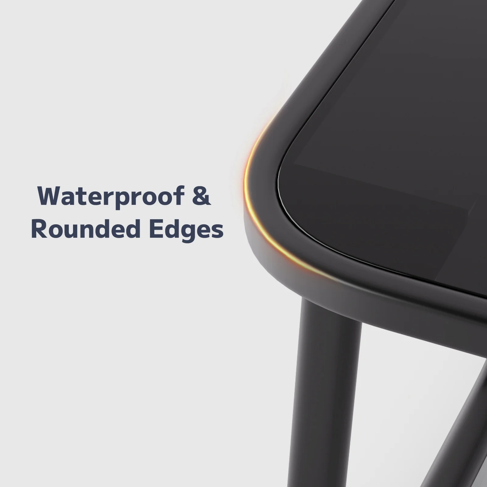 The square table features a durable metal top with a smooth glass layer and stable legs equipped with adjustable knobs for balanced placement.