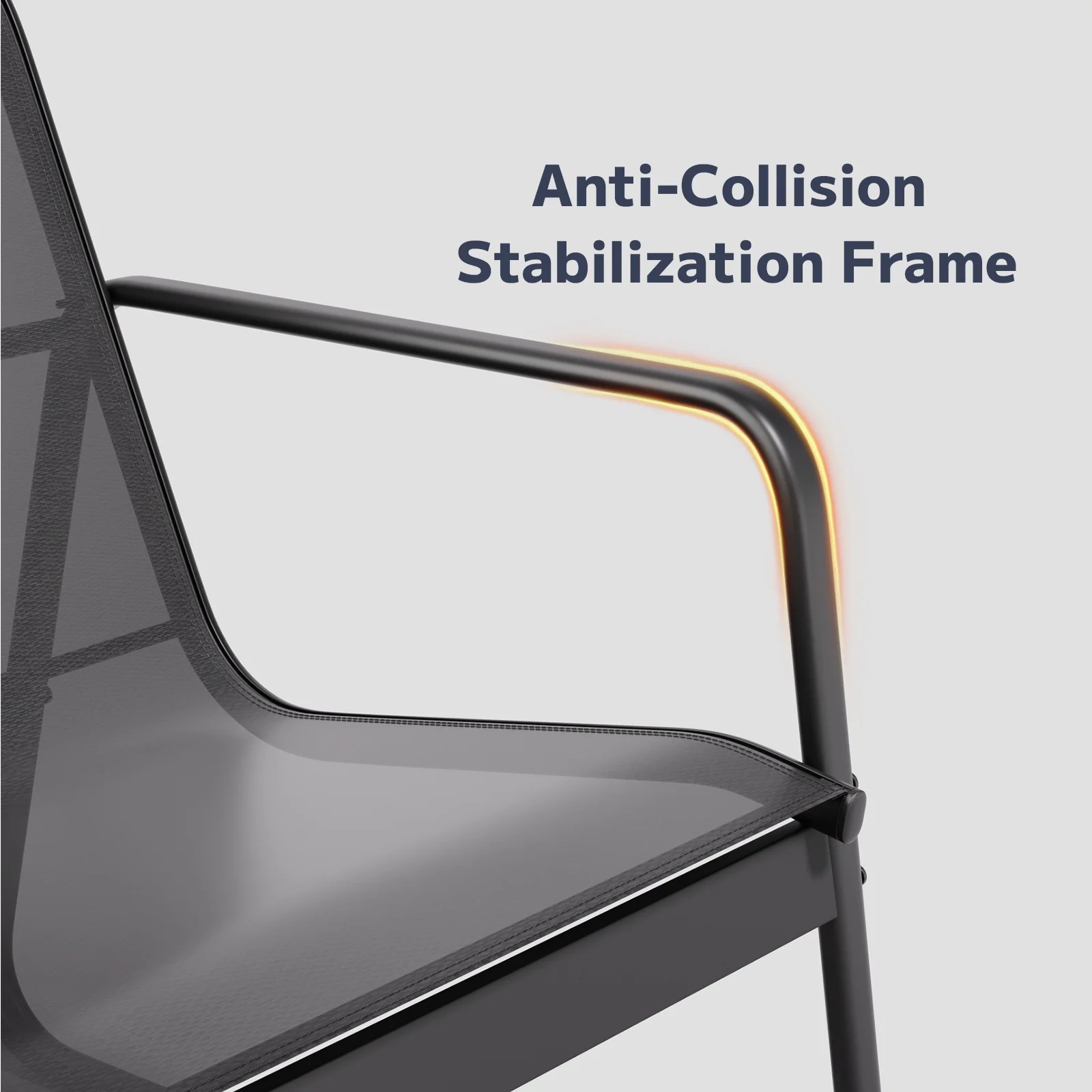 Each chair uses a breathable textile material that stays cool and comfortable. Reinforced metal framing provides stability, and each seat holds up to 330 lbs.